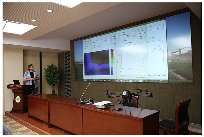 總經理邀請到南京農業大學程教授主持報告會,Michels博士詳細介紹了UHD185的原理、參數、優勢,并結合UHD185的光譜高分辨率及470g超輕重量等優勢與本公司蜘蛛雀八旋翼無人機懸停穩定、有效載荷2kg等絕對優勢進行了應用案例展示,總經理為到場參會人員進行現場翻譯,并共同為到場參會人員進行答疑及技術交流。