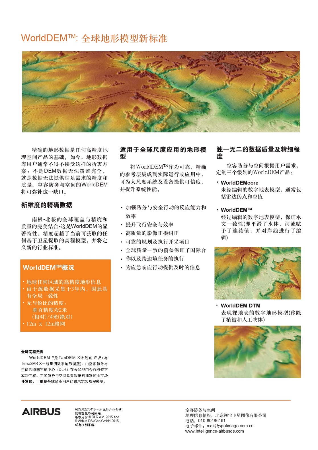 北京德中天地科技有限責(zé)任公司為法國(guó)AIRBUS公司的中國(guó)代理商。AIRBUS公司的WorldDEM是全球首個(gè)高分辨率(5米)數(shù)字高程模型,源于TerraSAR-X和TanDEM-X衛(wèi)星數(shù)據(jù),提供全球無縫覆蓋,具有高精度(相對(duì)垂直精度2m,絕對(duì)精度6m)和高質(zhì)量,定義了全球高程模型新標(biāo)準(zhǔn)。